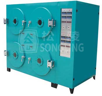 本真空干燥箱是松陵電器研究、開(kāi)發(fā)的專用于電池極片烘烤的新產(chǎn)品。真空室為圓筒形,便于電池極片整卷裝載,在真空狀態(tài)下烘烤。多個(gè)真空室組合成一個(gè)整體,結(jié)構(gòu)緊湊,節(jié)省工作場(chǎng)地;配置一臺(tái)真空泵抽真空,多個(gè)真空室分別控制加熱,獨(dú)立工作,靈活方便。同時(shí),抽真空系統(tǒng)采用數(shù)顯真空計(jì),自動(dòng)控制真空度的上下限。真空室的外部和中軸均設(shè)置有加熱裝置,并分別配置高精度溫控儀控溫。真空室圓門的中間設(shè)置圓形觀察窗。產(chǎn)品投放市場(chǎng)后,受到了電池極片生產(chǎn)廠家及相關(guān)用戶的好評(píng)。